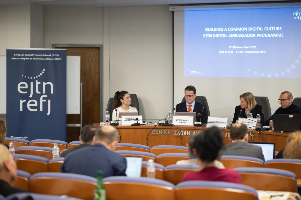 One of the key initiatives of the year was the EJTN Digital Ambassador Programme, titled ‘Building a Common Digital Culture’, which delivered a rich combination of training, collaboration, and exchange of best practices. This pioneering programme was built around the Digital Competence Framework for Justice Personnel, developed in collaboration with EJTN member, Centre for Legal Studies in Spain. The programme consisted of two hybrid conferences, complemented by an eight-session webinar series and a dedicated e-learning course, produced in partnership with the HELP Programme of the Council of Europe.