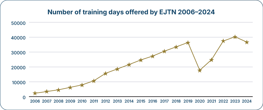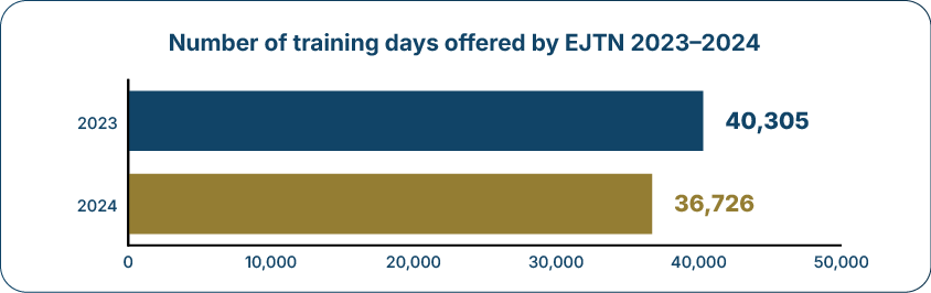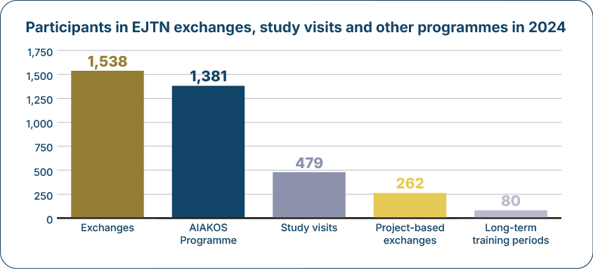Throughout 2025, EJTN continued to provide high-quality judicial training activities, including exchanges, study visits, seminars and more. Through this highly specialised offering, EJTN reached a wide range of participants from across the EU, offering both face-to-face and online learning opportunities. Below are some of the key figures from 2025.
